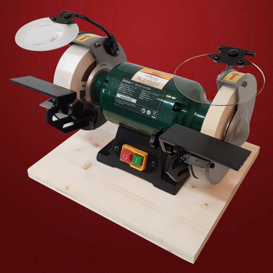 Zum Trockenschleifen verwenden wir eine Doppelschleifmaschine der Firma Record Power, die wir speziell für Sie zusammenstellen: