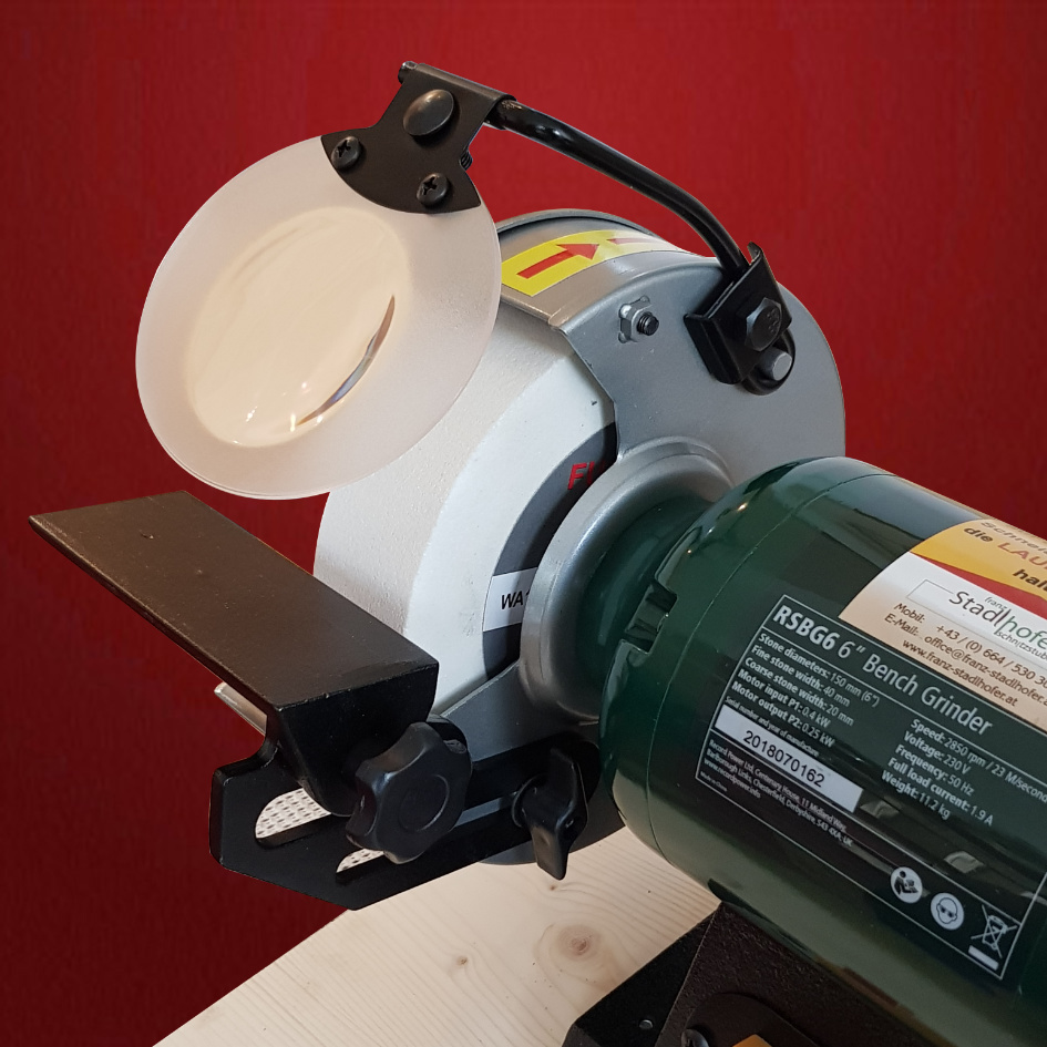 Montiert auf einer stabilen 3-schicht Platte (ca. 30 x 35 cm) und ausgestattet mit einer harten Filzpolierscheibe (Maße: 150 x 20 x 20 mm) sowie einer Edelkorund Schleifscheibe (Maße: 150 x 40 x 32 mm).